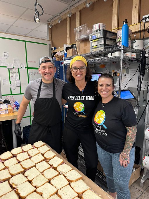 • WCK Chef Corps member Christi Ferretti (center) and her team at Pine Valley Market immediately stepped up to support their community by preparing sandwiches for us to distribute while scouting for families in need of nourishment just 10 miles south in Carolina Beach.