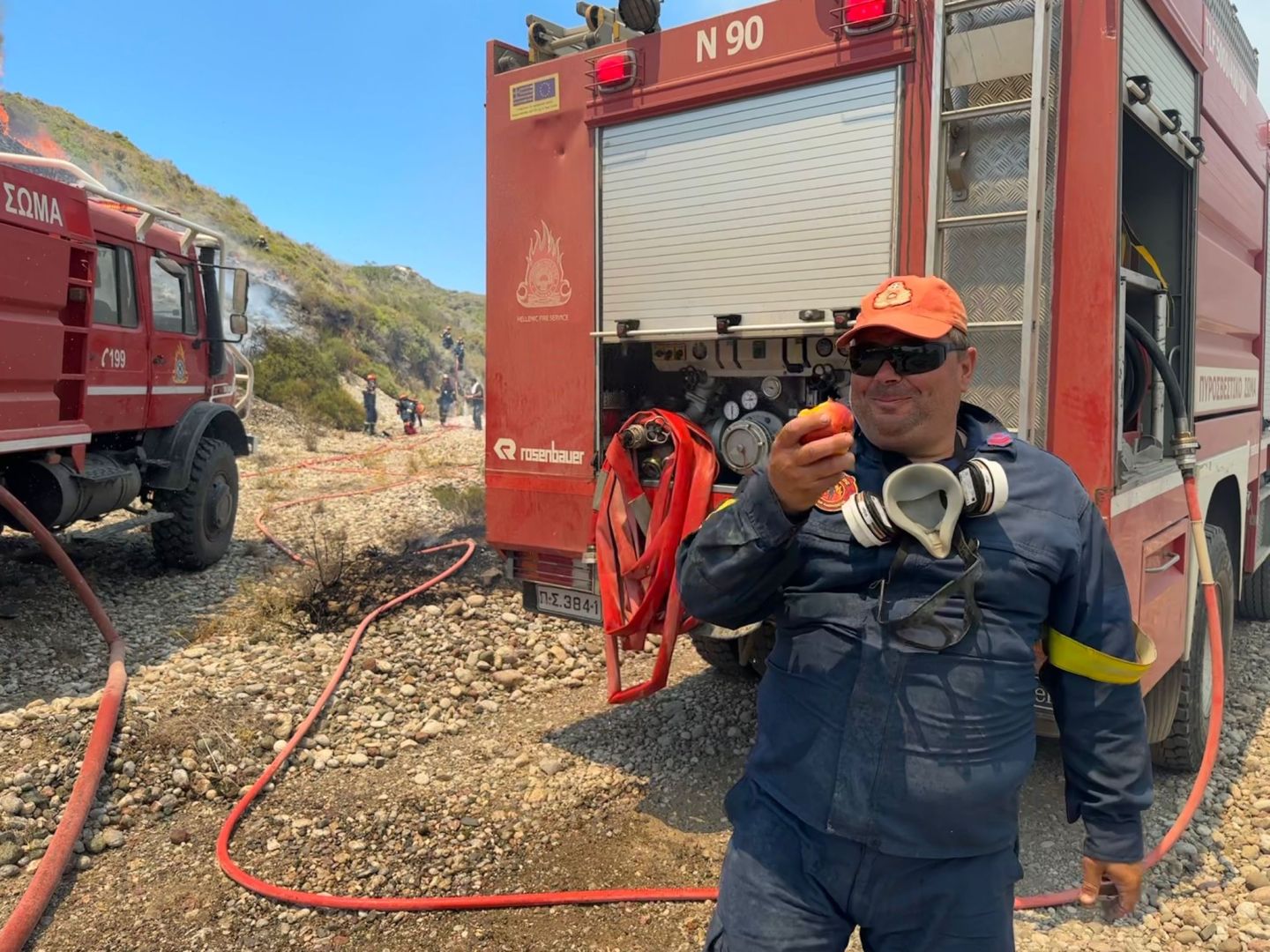 Valasia grew up on the island of Rhodes and volunteered with WCK to help feed her community. Here she is in Vati, helping distribute sandwiches, cold water, and fruit to firefighters and locals battling the wildfires.