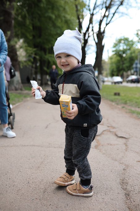 • Weighing 30 pounds each, our grocery kit delivery often turns into a group effort by families picking up! Yesterday the WCK team brought 650 of these food kits to this community a few hours outside Dnipro. Included in the bags? Fruit bars for the kids! 🍎🍇🍌 #ChefsForUkraine