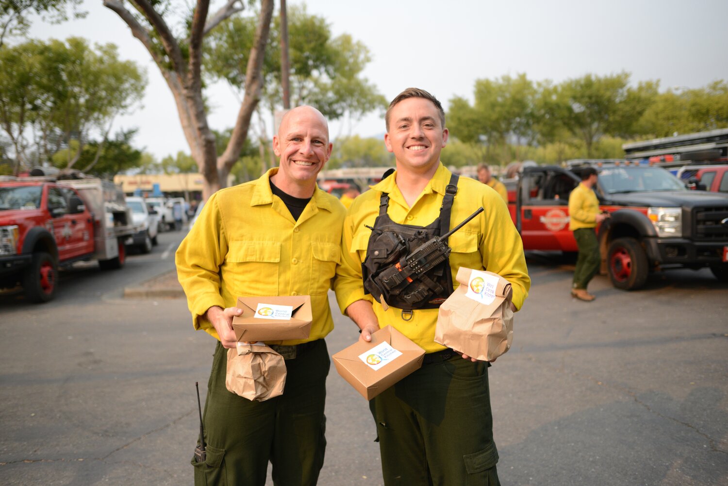 When preparing meals for firefighters working in incredibly challenging circumstances—they’re subjected to extreme heat and heavy smoke, all while bearing the weight of uniforms and equipment—it’s critical we provide them with not only a hot, delicious meal but something that will keep them nourished and full. The bagged lunches we have been serving from the kitchen in Santa Rosa contain a full cup of Chef Elsa’s green chili, a fresh salad, a piece of cold fruit, and a hearty ham and cheese sandwich.