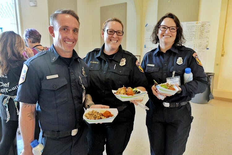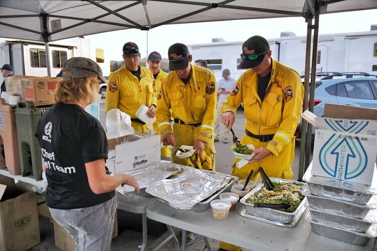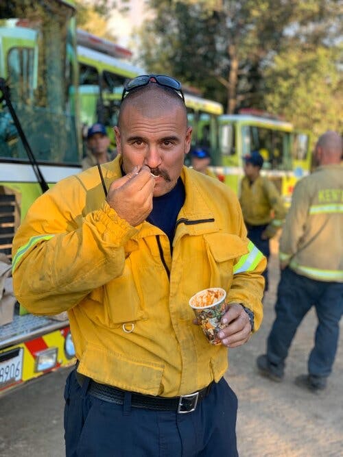 Our Relief Team got on the ground in Sonoma County and began efforts on Friday, October 25, just 36 hours after the Kincade Fire sparked. The first meal we prepared was hot chili, which we served alongside a piece of fresh fruit to firefighters working 24-hour shifts battling the wildfire.