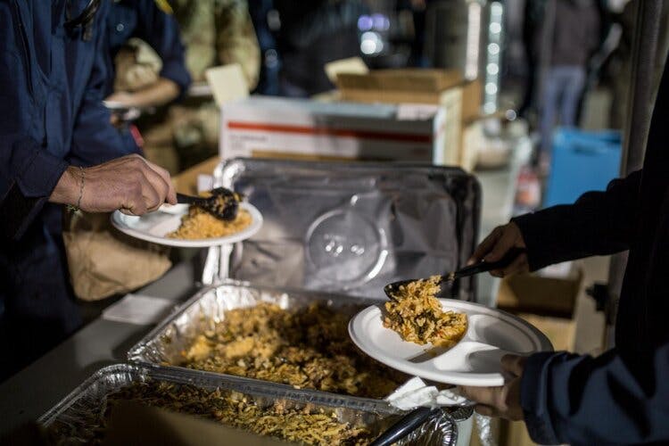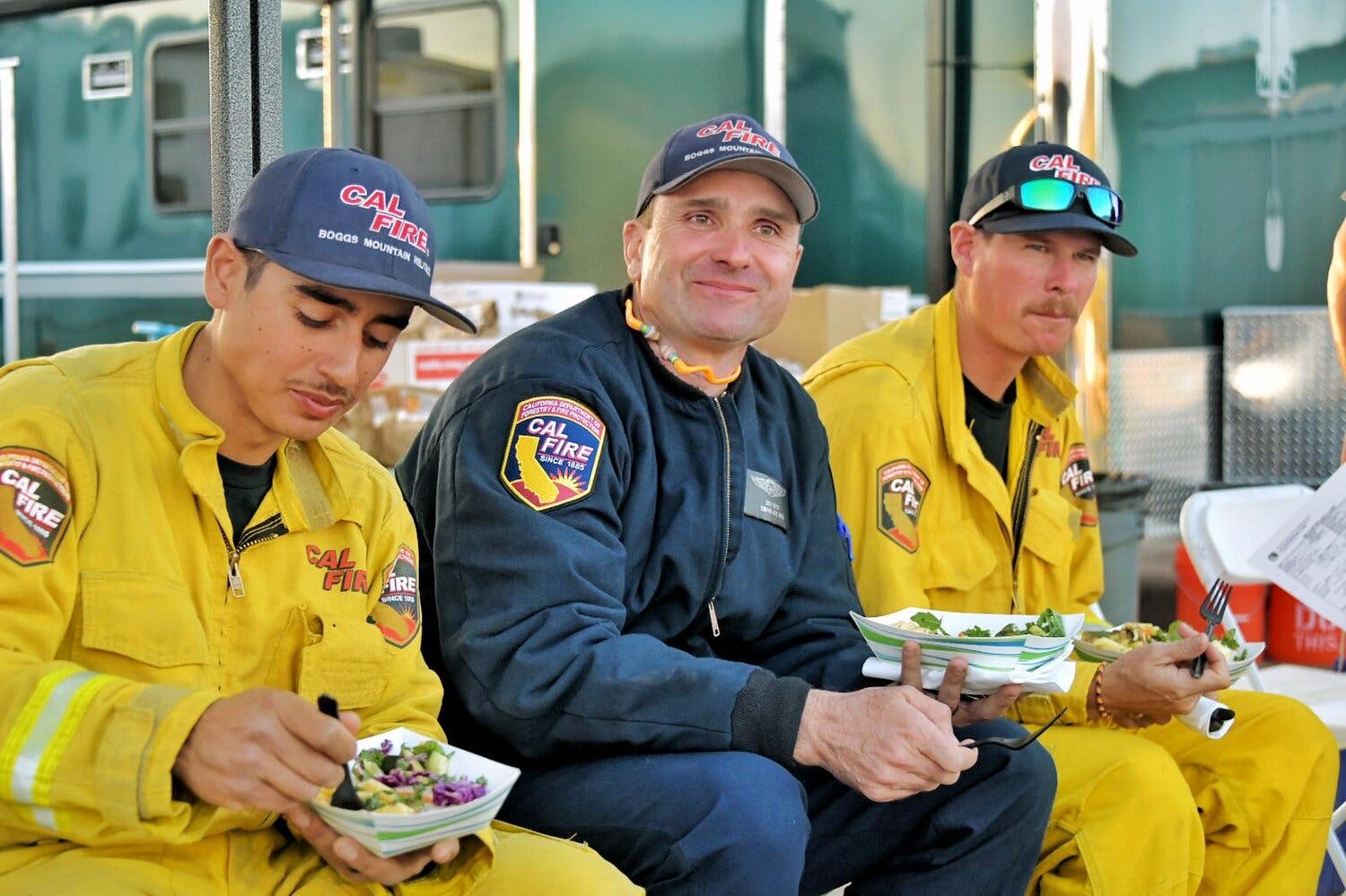 On Monday, October 28, the team heard that there was a group of CALFIRE helicopter pilots and crew that weren’t getting warm meals, so we headed up to Cloverdale Airport to serve the group of 150 men and women. This crew of pilots and staff are responsible for dropping both retardant and water during responses, pulling water from local sources and making up to 10 flights per day in their firefight. On the menu for the group was pulled pork, black-eyed peas, and collard greens over dirty rice along with a meal of hot chili, fruit, and a ham & cheese sandwich, packed in a to-go bag for their flights.