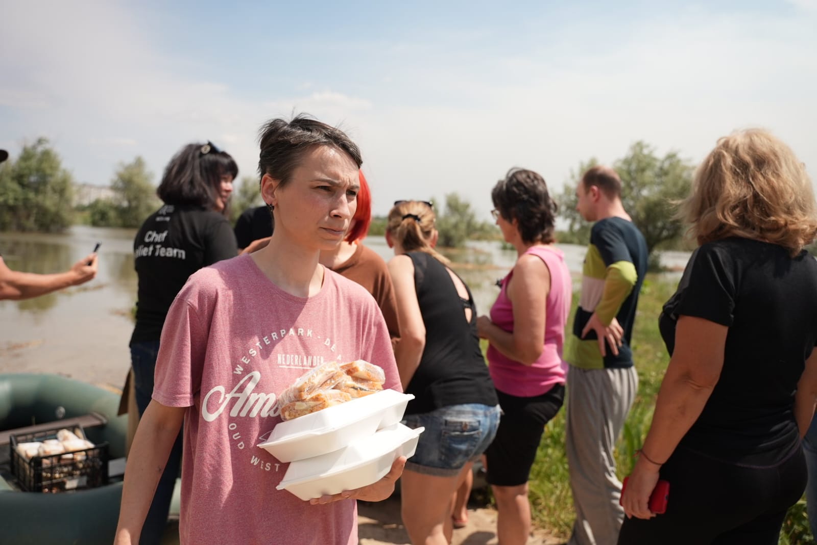 In the days following the disaster, WCK has been distributing food and water, even as flood waters continued to rise in some communities. Our teams reached families with meals as the Ukrainian State Emergency Service was leading evacuation efforts. In some cases, this meant transporting meals on inflatable boats. Teams took hot meals, sandwiches, water, cookies, “anything we could get at our warehouse,” said Julia, WCK’s local coordinator for Kherson, who is leading our regional response to the flooding. “We took everything with us.”