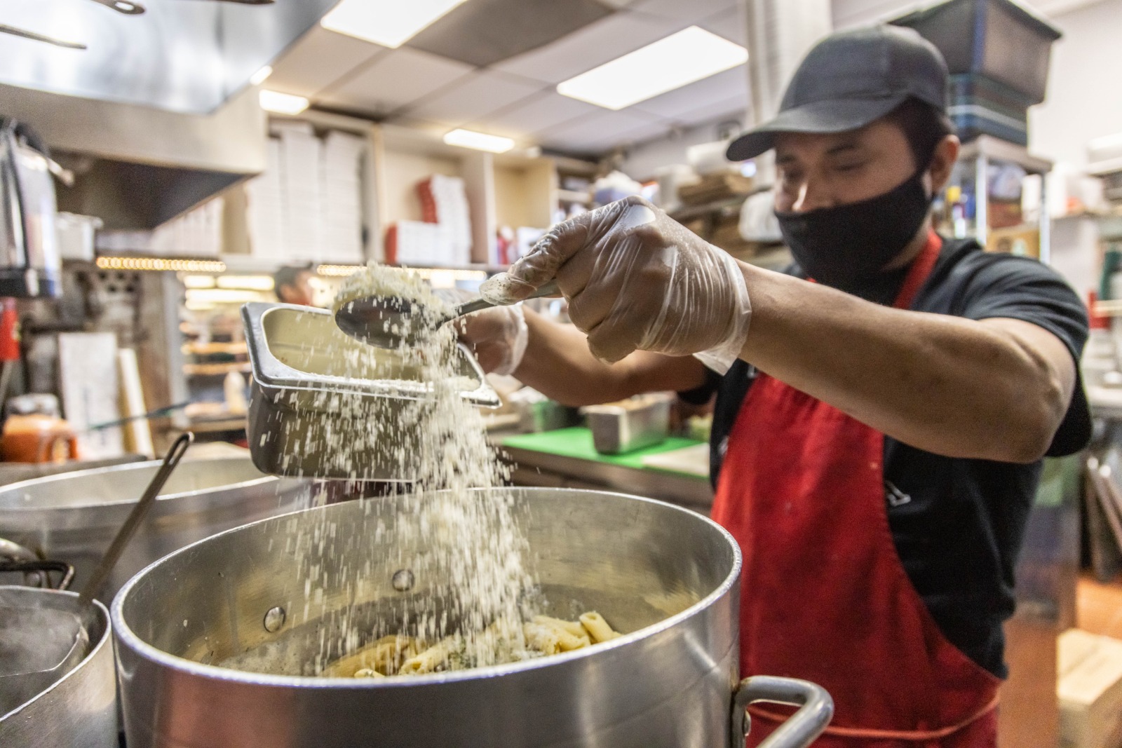 Silvano, is a cook at Robert’s—a restaurant that opened back in 2008 and has been helping WCK serve meals to the community since April of 2020. Staying true to Robert’s pizza & restaurant theme, Silvano was cooking a scrumptious lunch of penne alfredo with meatballs.