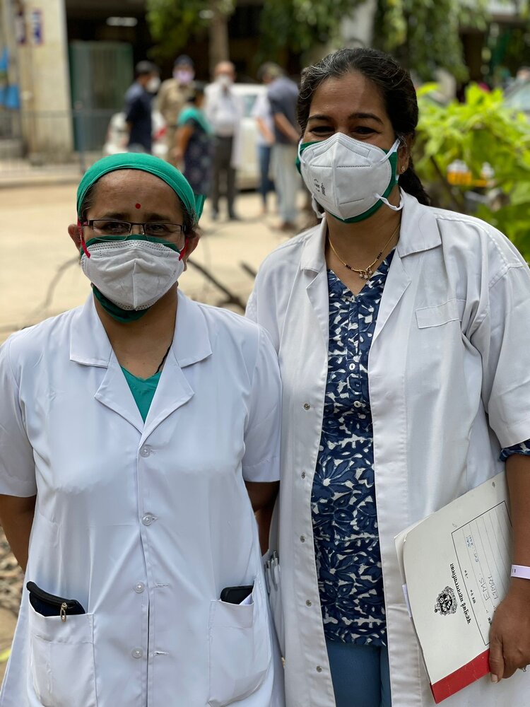 Rinki (left) and Sunita (right) are both nurses at Deen Dayal Upadhyay Hospital. They’ve been receiving WCK meals for several weeks now.