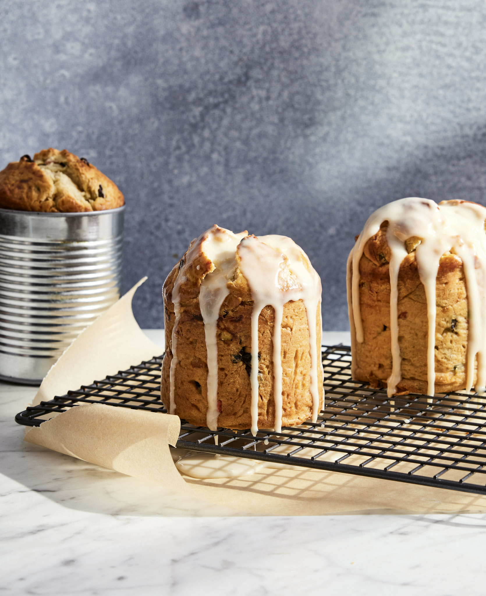 11. If desired, make the glaze: In a small bowl, mix together the powdered sugar, vanilla, milk, and lemon zest (if using). You can add food coloring if you want to make it more festive. When the breads are completely cool, drizzle the glaze over the breads evenly; it will harden after about 20 minutes.