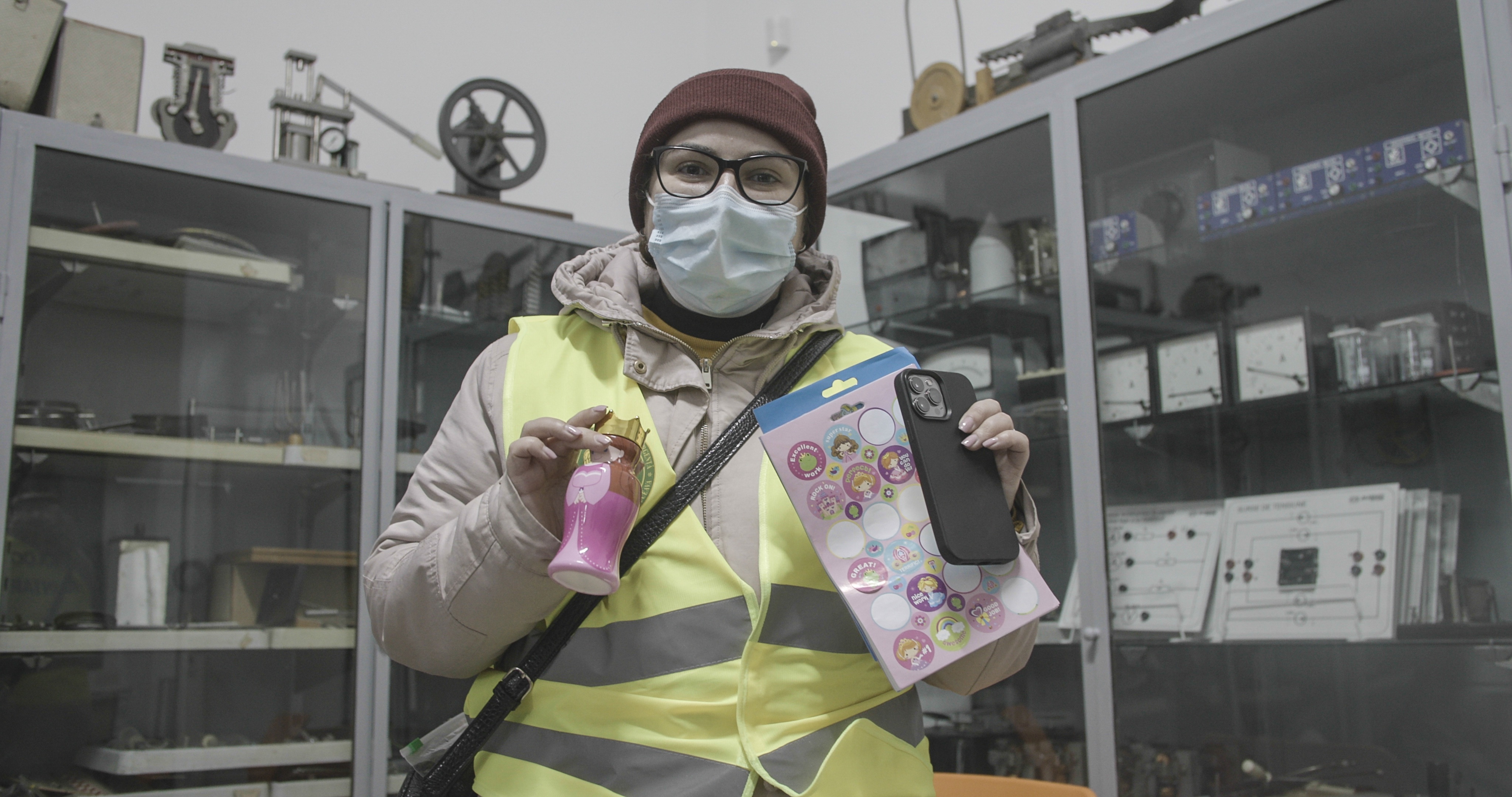 M. is a volunteer psychologist supporting children refugees at a shelter in Romania. M. has a first aid kit for children’s self-esteem that includes stickers and a bubble blower.