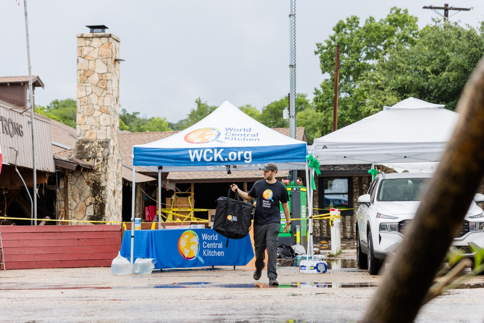 In Hunt, the iconic Hunt Store has long been a gathering place for live music and community dinners. Now, it has transformed into a vital hub for food and water distribution. WCK has served thousands of hot meals here, supporting residents and emergency crews responding to the deadly floods. Restaurant partners have set up operations on-site to prepare comforting, familiar dishes.