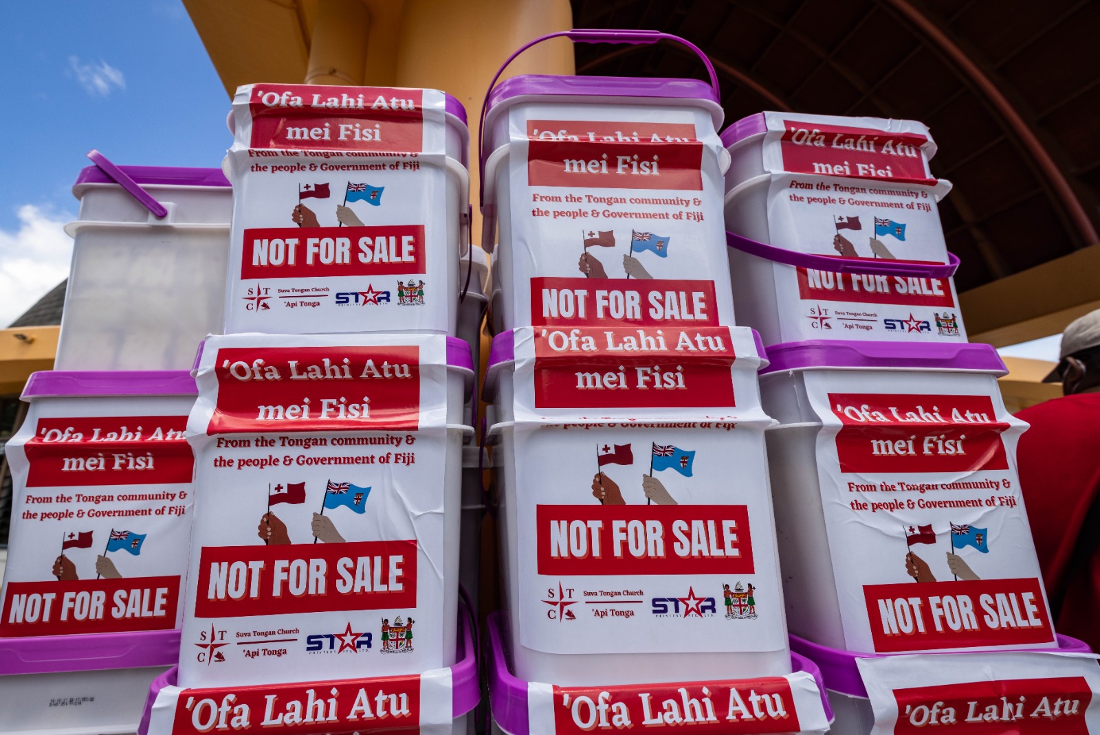 James, Davidson, and Mele, pictured below, are all from Tonga and university students in Fiji. Mele said they are volunteering to send relief aid to their loved ones and was personally inspired to volunteer because she didn’t know what kind of help people were receiving—she said she needed to do something, anything to help.