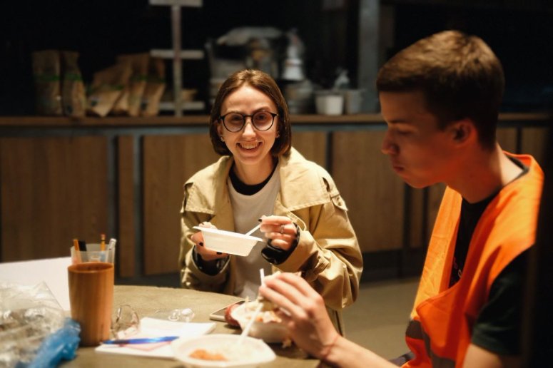 WCK’s Nate was nearby when the attack happened and visited the injured team members in the hospital. Their spirits were strong—Yulia, pictured on the right beside Nate, shared that she was eager to get back to the kitchen. The rest of Yaposhka’s team quickly got all salvageable food and equipment out of the damaged building and was back cooking in a new location within two days!