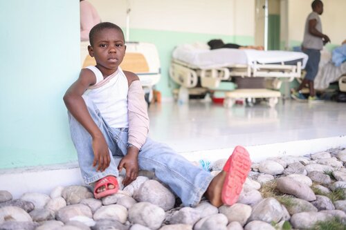 In Les Cayes, WCK’s Sam and Dr. Titus brought meals to several hospitals in the area, including OFTMA. There, we met Christine who had just undergone surgery due to fallen concrete damaging her liver. Her mom, Valeria, was at the market when the earthquake hit. Valeria returned home and found people huddled around her home, trying to pull Christine from under the concrete. Thankfully, Christine is doing better each day. Lens was also at home when the earthquake hit—he is recovering well after a piece of concrete fell on his arm.