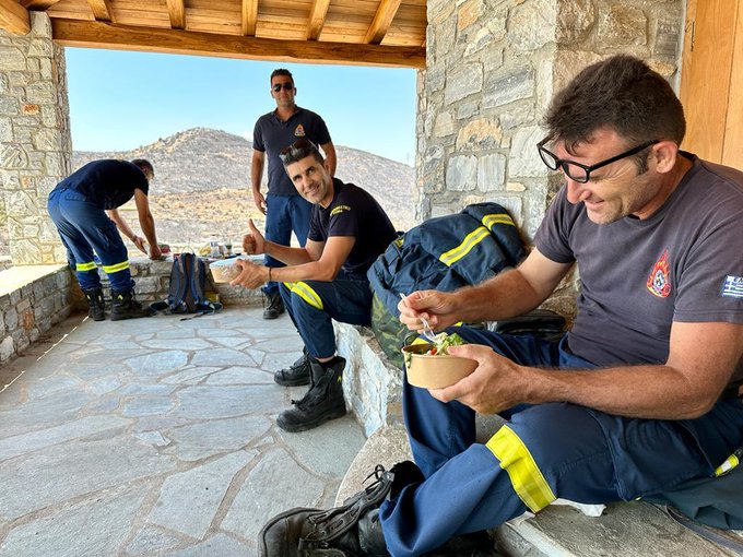• Despite making progress containing wildfires around Volos, firefighters remain on alert as high temperatures, dry conditions & wind can reignite flames. This crew was happy to take a lunch break & dig into WCK-provided salads loaded with chicken & greens! 🥗 #ChefsForGreece