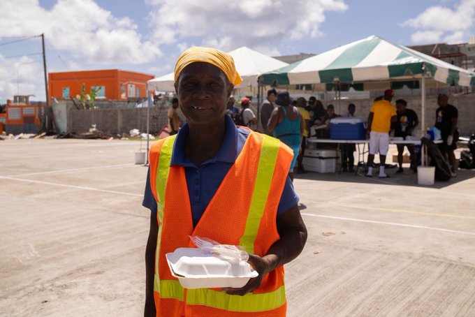 • Violet wakes up at 5am every day to help clear the roads on Carriacou of debris after Hurricane Beryl hit Grenada. Because of people like her, most of the roads are now clear and remote mountain communities are no longer cut off from aid efforts. She enjoyed her lunch break with a hot meal from a WCK distribution point near her worksite!