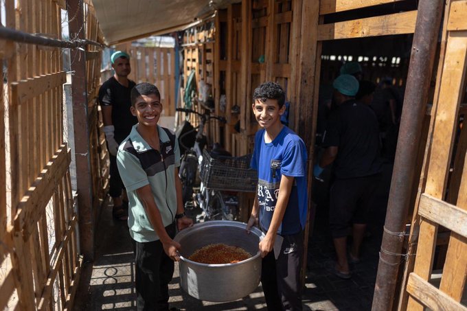 • Ahmed and Saeed make the journey to a WCK community kitchen in Khan Younis every day. Ahmed shares, “We walk a long distance, but that’s not what matters—what matters is bringing food home to our family.” Saeed adds with pride, “We distribute it to our neighbors as well because we know that many families can’t get food on their own.”