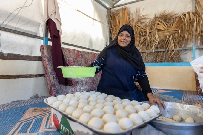 • Before the war, Dr. Akram was a media professor—he now leads a WCK community kitchen in Khan Younis. He and his team use WCK-provided pellet stoves and ingredients to prepare hundreds of hot meals every day. They also have a small bakery to make saj, a traditional flatbread served with every meal.